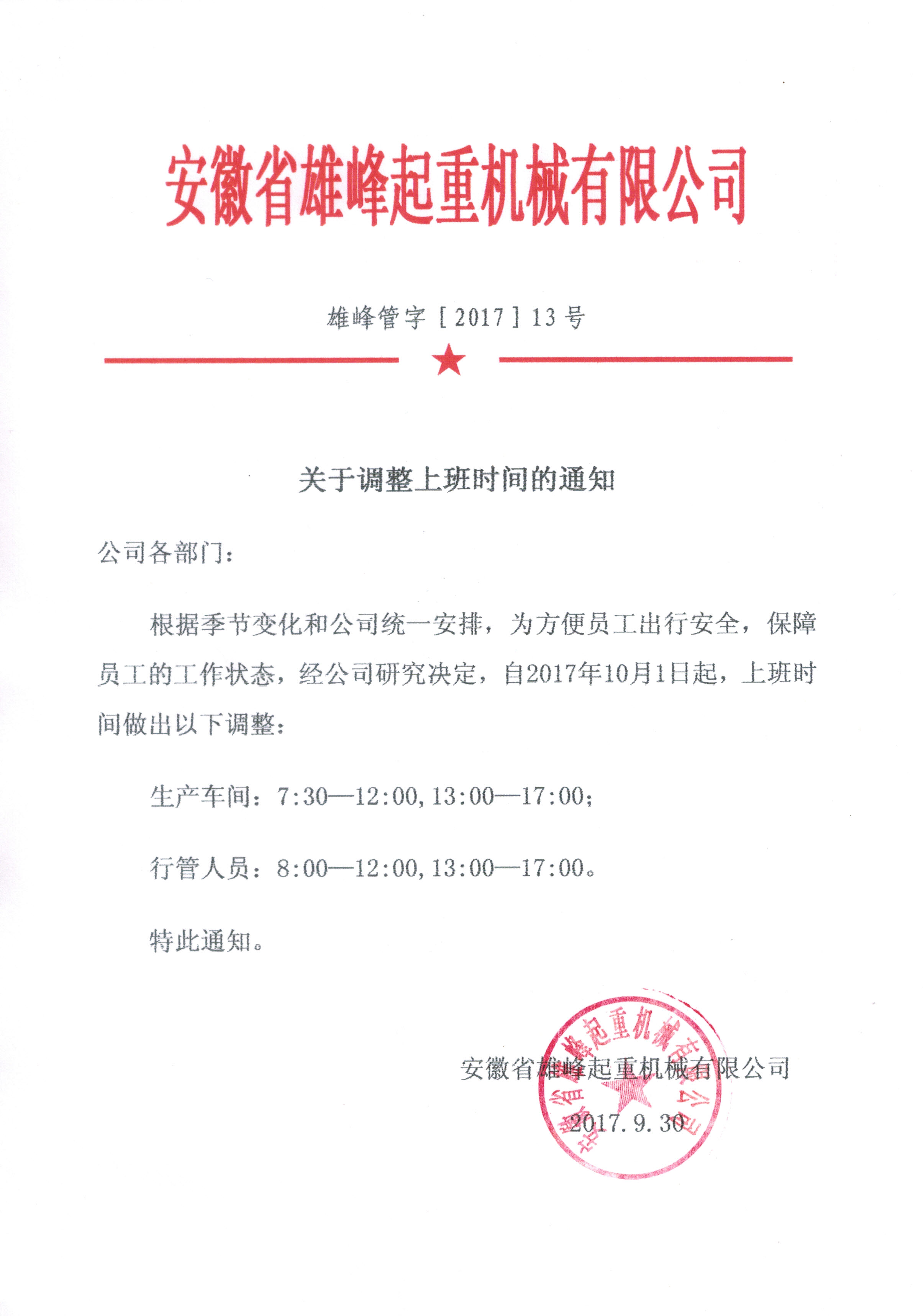 根據(jù)季節(jié)變化和公司統(tǒng)一安排,為方便員工出行安全,保障員工的工作狀態(tài),經(jīng)公司研究決定,自2017年10月1日起,上班時(shí)間做出以下調(diào)整: